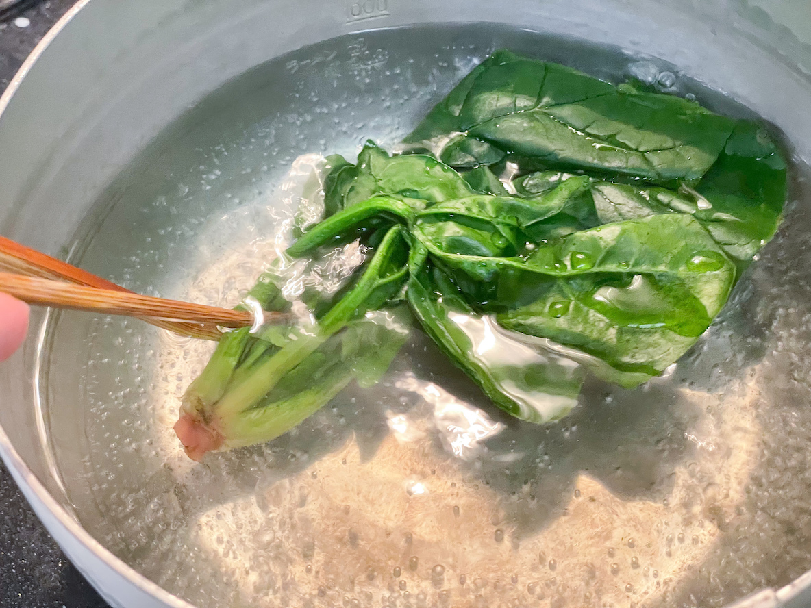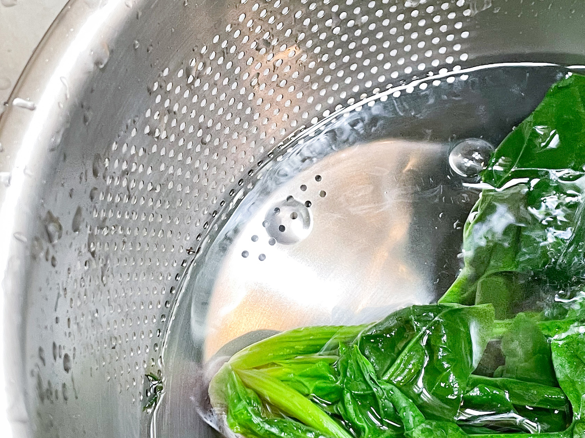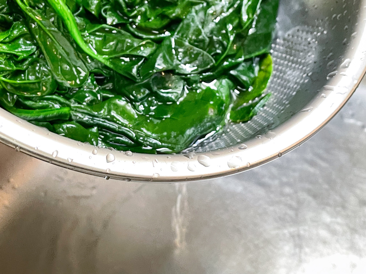 おかげで茹で上がったほうれん草を入れても、冷水ですぐにキュッと締めることができ、食感がよくなりました。手早く水を切って、完了!