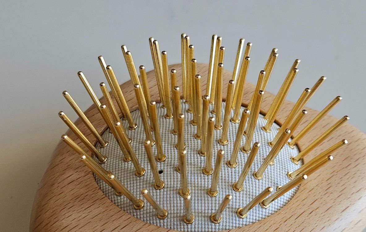 カッサブラシのボディには針山のようなクッションがあり、そこに金色のピンが刺さっています。