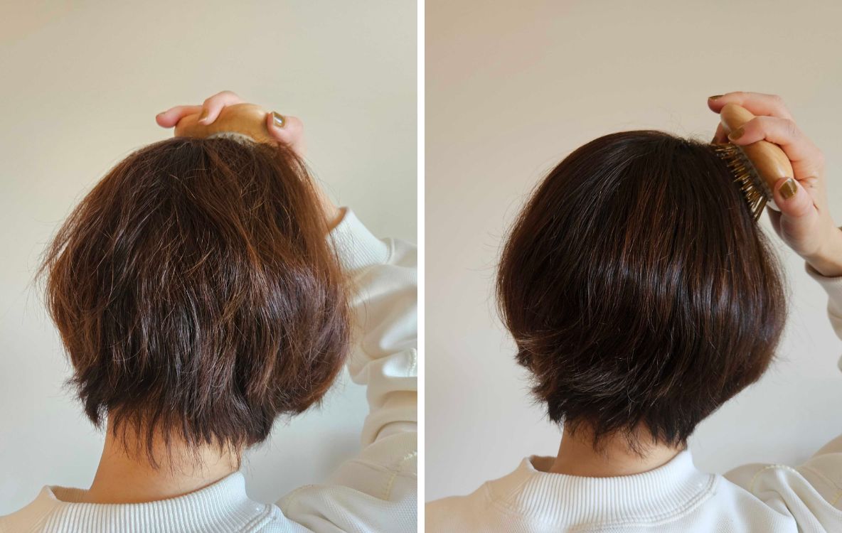 私の今の髪は、癖っ毛で乾燥によってパサパサしている状態です(左側の写真)。そこに櫛の感覚で数回とかしてみたところ、右側の写真のように髪がまとまりツヤも見えてきました。