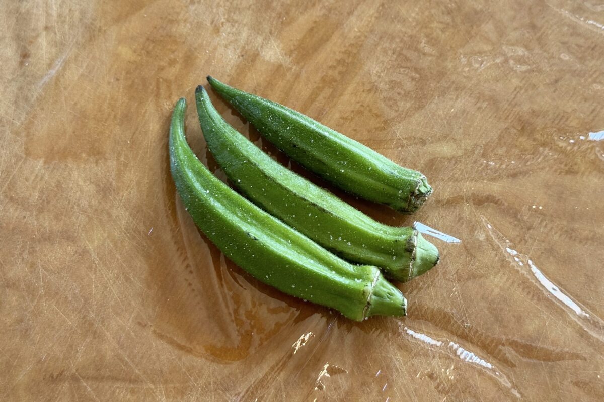 オクラ(3本)に塩を振って板ずりをし、ラップに包んで500wの電子レンジで1分加熱。氷水で冷やしておきます。