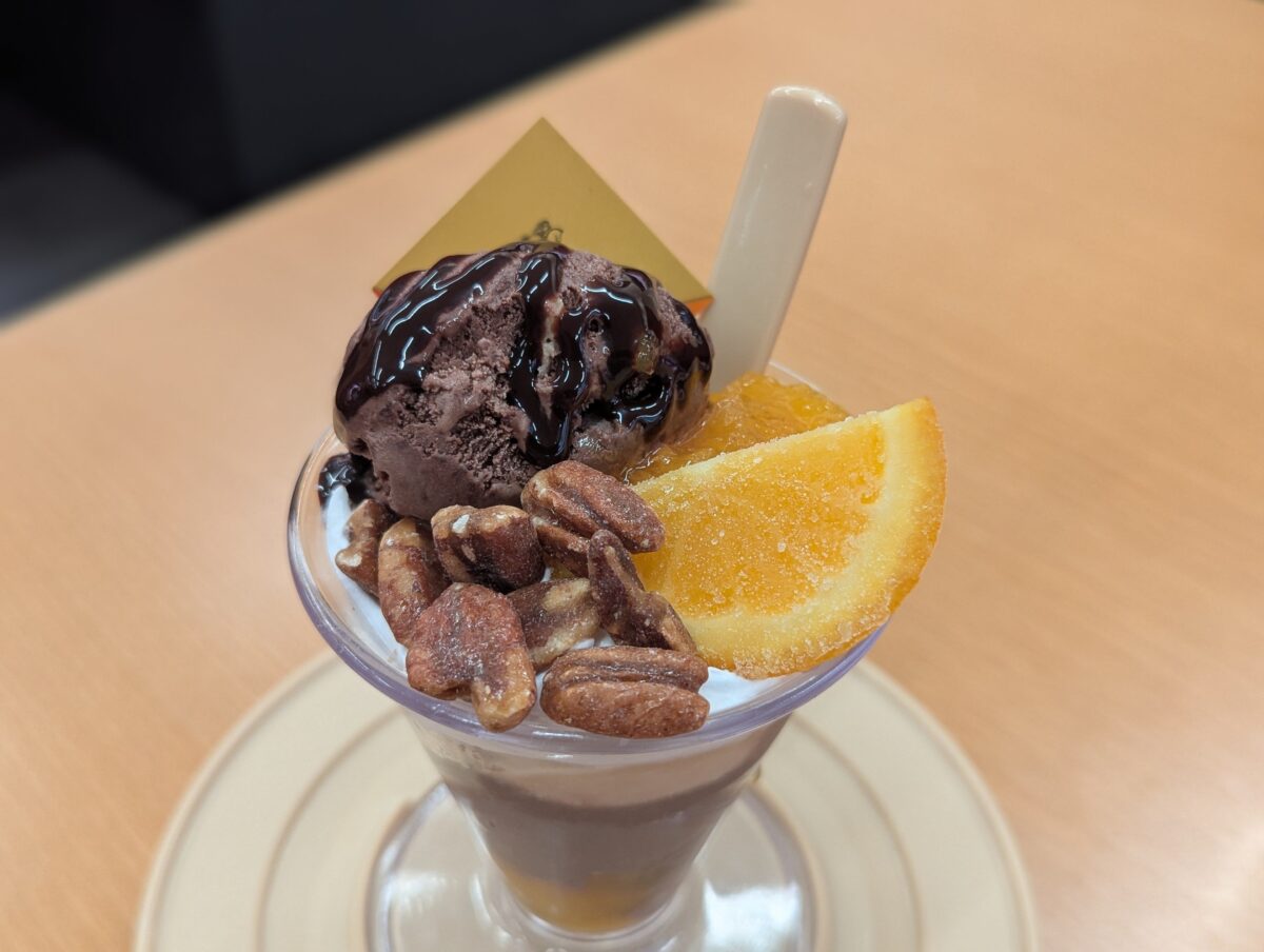 まず1品目は、『オランジュショコラナッツパフェ』。ナッツのサクサク感にビターチョコが練りこまれた濃厚なショコラアイスやキャラメルアイス、クリームにムース、冷凍オレンジなどさまざまな具材が楽しめる一品だ。
