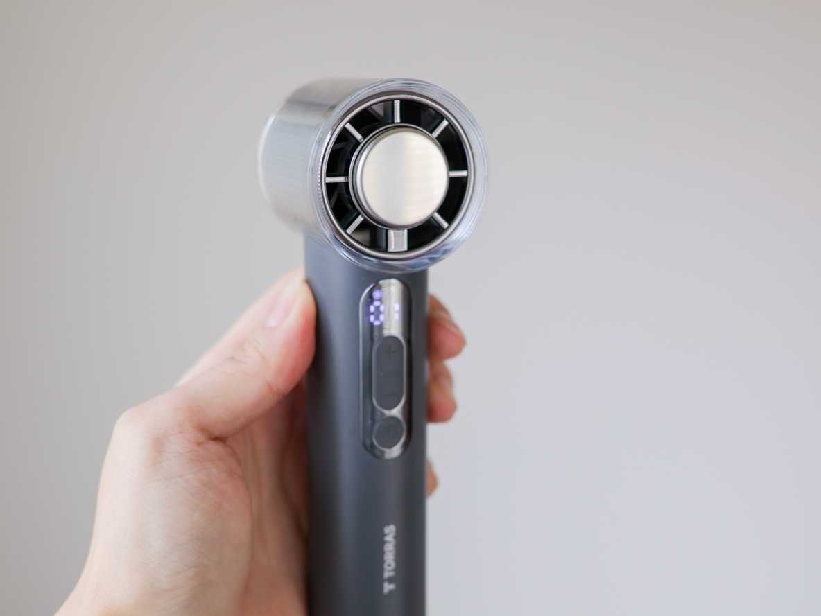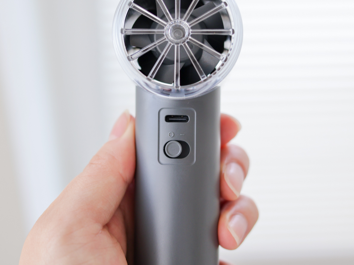 使うときは持ち手の裏側の電源をオンにしてから、表側の「+」ボタンを押して風量を調節。