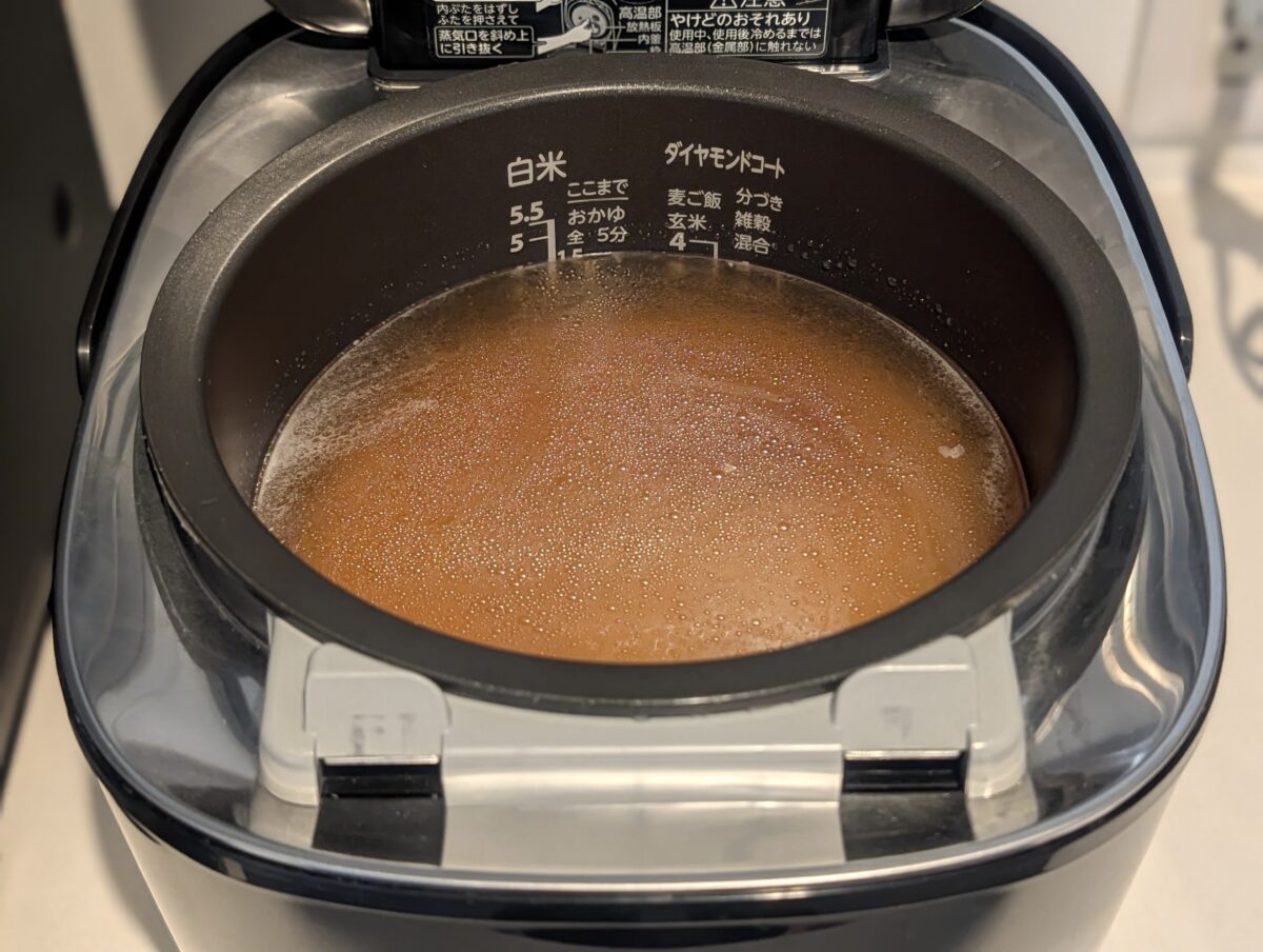 次に炊飯器に入れた米に冷ました煮汁を入れ、目盛りまで水を注いで炊飯する。今回は無洗米を使用したので下準備はしなかったが、とぐ必要のある米を使う場合は浸水しておこう。