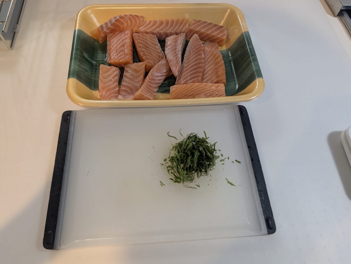 次にサーモンをひとつ30~40グラム程度のぶつぎりにし、大葉もせん切りにしておく。
