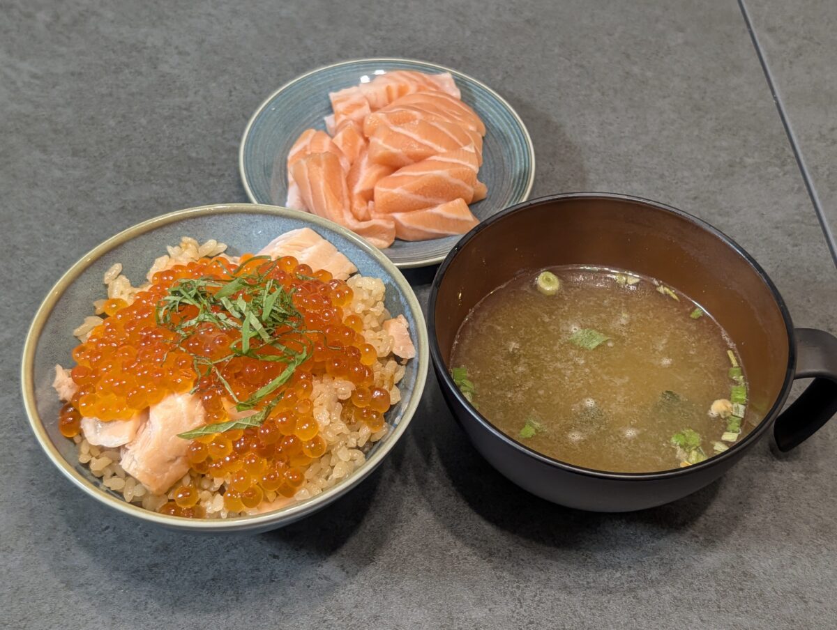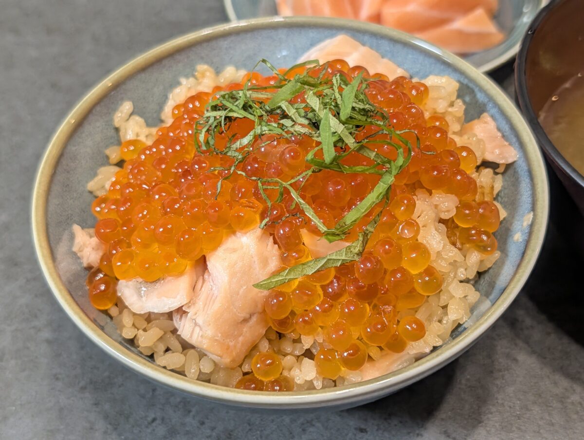 サーモンを一緒に炊きこまないことでふんわり柔らかな仕上がりになっており、絶妙な食感。醤油漬けのいくらとの相性もバツグンで、大村CAも動画で言っていたが何杯もおかわりできそうな美味しさである。