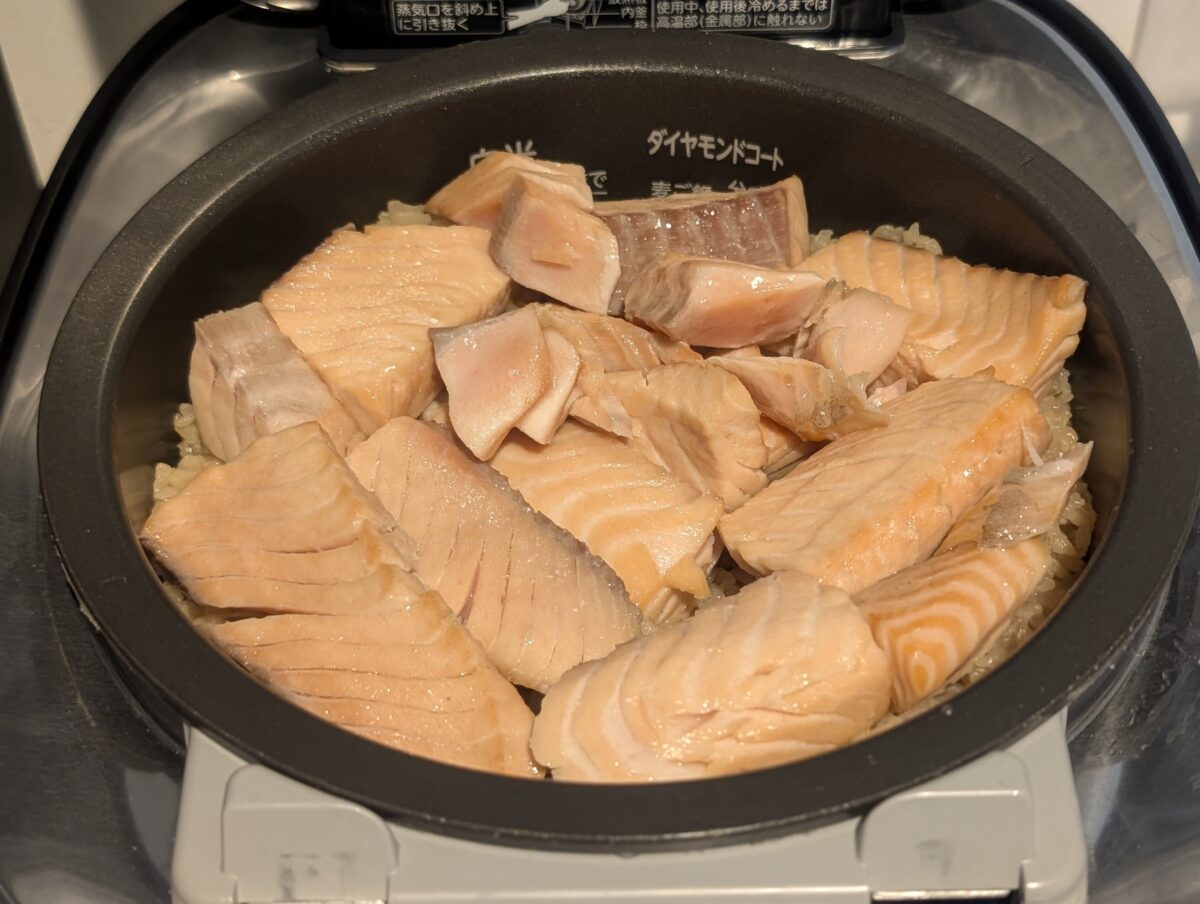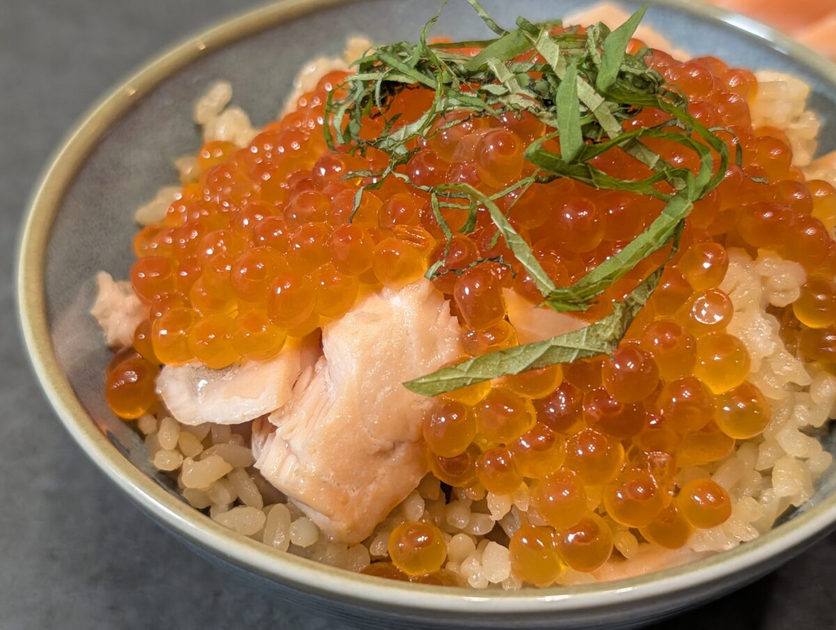 米を炊き終えたらサーモンを入れ、3分ほど保温して温め、最後にいくらと大葉をかけたら完成だ。