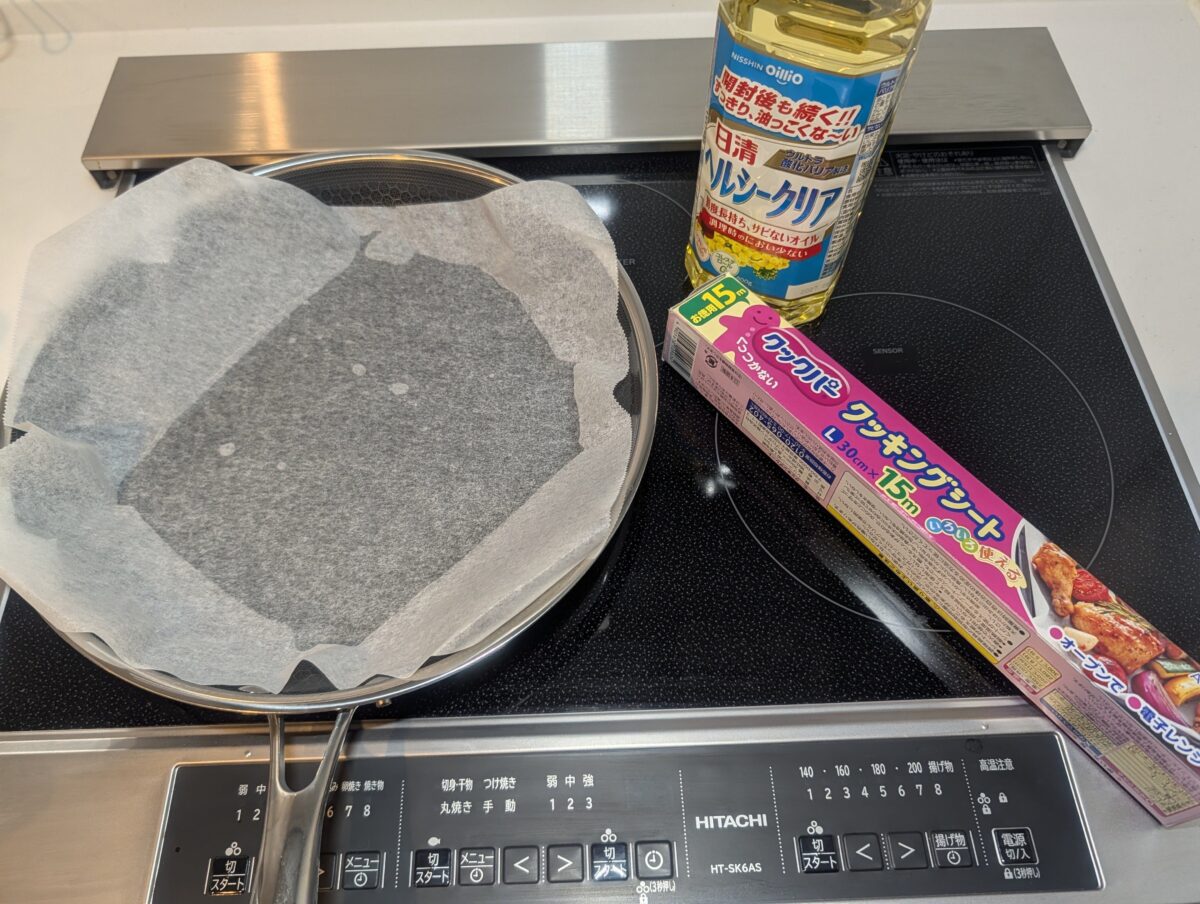 次に、フライパンへ油を注ぎ、その上からクッキングシートを敷く。