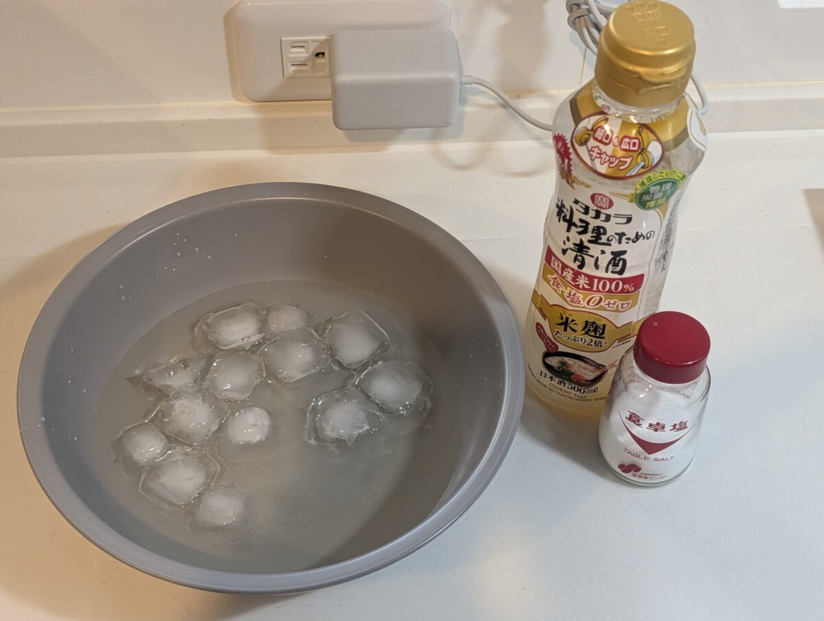 次にボウルで塩二つまみに日本酒を大さじ3杯を混ぜ、氷を入れたものを用意。今回は焼くさんまが多かったので、多めに作っている。