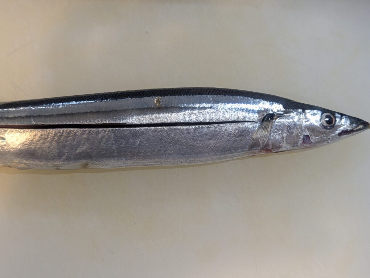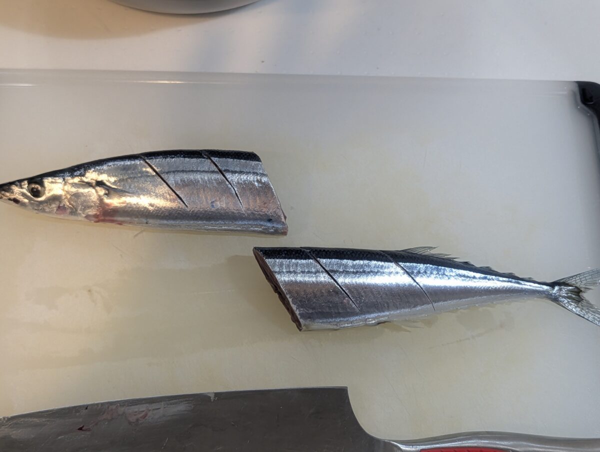 まずはさんまに横一線に包丁で切れ込みを入れる。火の通りをよくするためなので、そこまで深くなくてOKだ。