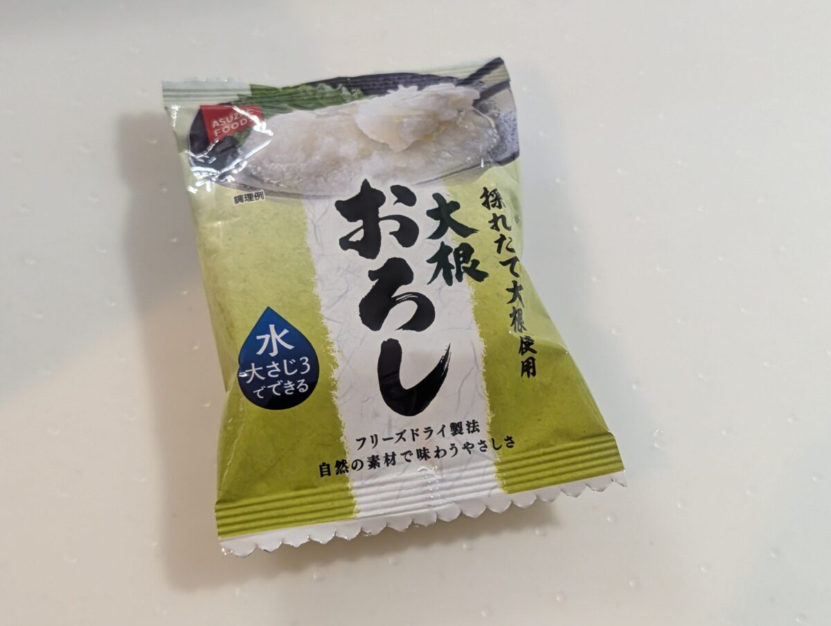 この焼き方だと塩味が全体に付いているため別で味付けは不要だが、あえて薬味や調味料を加える場合のお勧めは、フリーズドライの大根おろし。水を加えるだけで大根おろしができるだけでなく、辛味が抑えられているのでとても食べやすい。