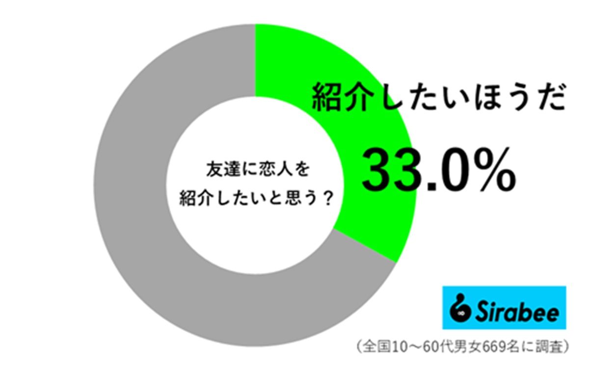 まずは、Sirabee編集部が「友達に恋人を紹介したいと思うか」について、アンケート調査を実施。すると、男女669の回答を得ることができ、男女33.0%が「紹介したいほうだ」と回答しました。