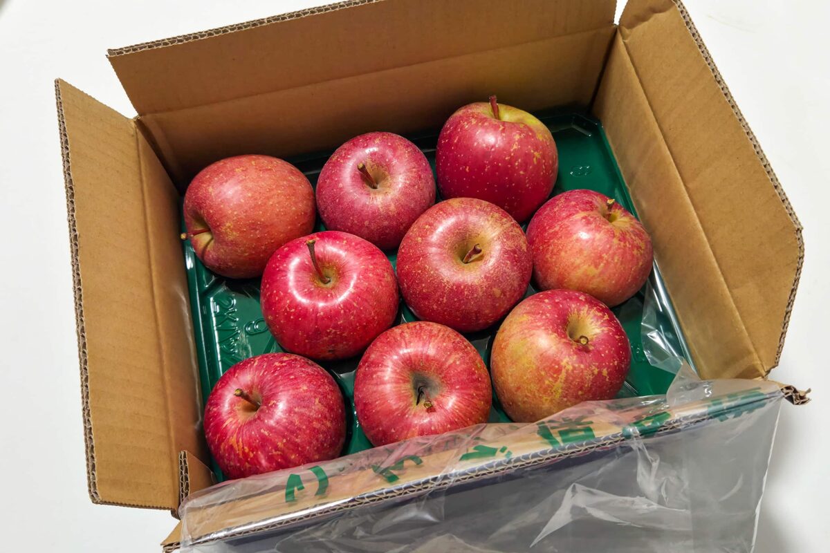 野菜、果物コーナーで購入したのは「りんごサンふじ簡易箱」(1,598円)。
