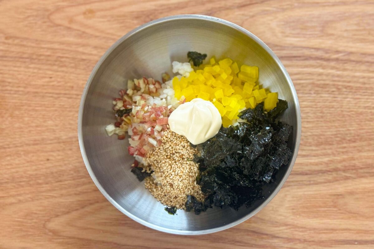 ボウルにご飯、たくあん、みょうが、白炒りごま、マヨネーズ、韓国のりを加えて、全体を混ぜ合わせましょう。韓国のりは手で千切りました。